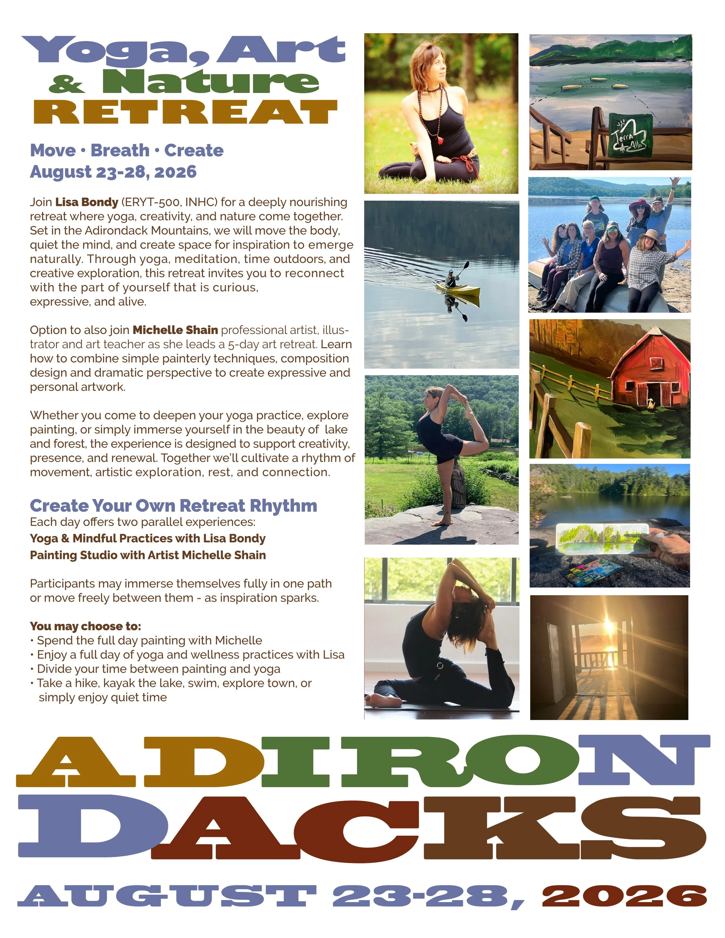 Each day offers two parallel experiences: Yoga & Mindful Practices with Lisa Bondy and Painting Studio with Artist Michelle Shain.