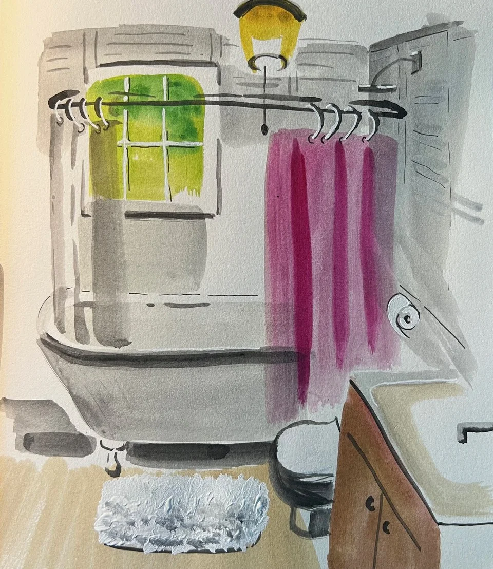 Paintbrush is in hand whenever I am on the road, on a boat, train or plane. I'll sketch in a café, on a park bench, mountaintop or at a picnic. I am Michelle Shain. My background and education in graphic design helps me use lettering, striking composition and playful scale juxtaposition to tell painted stories.